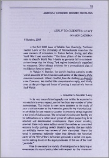 Ընթերցողներին է ներկայացվում հանրահայտ ցեղասպանագետ Վահագն Դադրյանի պատասխանը Հայոց ցեղասպանության ժխտման «ջատագովներից» մեկին՝ Գունտեր Լևիին, ուր հանգամանորեն, համոզիչ փաստարկներով ապացուցվում է Հայոց ցեղասպանության ժխտման ողջ սնանկությունը: Читателям представляется ответ известного американского ученого, специалиста по геноциду армян Ваагна Дадряна одному из "ярых сторонников" отрицания Геноцида армян Гюнтеру Леви-одному из тех ученых, которые безосновательно стараются отрицать факт армянского геноцида. Обстоятельно, убедительными фактами в этом ответе доказывается все банкротство отрицания факта армянского геноцида.