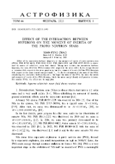В рамках релятивистской теории среднего поля исследовано влияние взаимодействия гиперонов на момент инерции протонейтронных звезд (ПНЗ) PSR J0740+6620, PSR J0348+0432, PSR J1614-2230 и PSR J0737- 3039A. При учете взаимодействия между гиперонами: а) при одинаковом радиусе R масса ПНЗ уменьшается, б) при одинаковом давлении р плотность энергии увеличивается, в) при одинаковой центральной плотности ε c момент инерции I ПНЗ уменьшается. При ограничении массы ПНЗ, в результате взаимодействия между гиперонами, чем больше масса ПНЗ, тем больше уменьшаются радиус и момент инерции ПНЗ, а плотность энергии и давление увеличиваются. Для менее массивных ПНЗ эффект может быть незначительным.